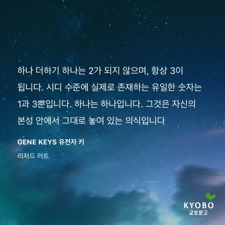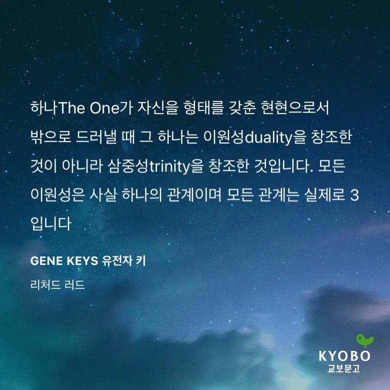 2번 유전자키는 말한다. "하나 The One가 자신을 형태를 갖춘 현현으로서 밖으로 드러낼 때 그 하나는 이원성 duality을 창조한 것이 아니라 삼중성 trinity을 창조한 것입니다. 모든 이원성은 사실 하나의 관계이며 모든 관계는 실제로 3입니다." 어떤 관계를 '우리'라고 생각하고 대했던 나는 하나와 하나가 만나 '너', '나', '우리'라는 삼원성을 드러낸다는 근원의 진리를 모르고 있었다. 독보적 존재인 나, 그리고 너의 유일한 존재를 인정하고, 그로 하여금 창발 되는 '우리'가 서로의 독자성으로 하여금 미처 예상하지 못한 방향으로 창발에 창발을 만들어갈 때, 너와 나를 굳이 분리해 '너는 이러이러하니까'라는 시선으로 보는 것 자체가 어불성설임을. '우리'의 근원에는 자유와 신선성을 보유한 '나'와 '너'가 있어야 함을. 그리하여 '우리'는 창발의 결과이며, 이 관계의 근본에는 자유로운 너와 내가 존재해야 함을, 또한 우리를 만들어내는 여정에서는 너와 나가 다르지 않음을 깊이 깨달은 가운데 각자의 독보성을 허용해야 했다.