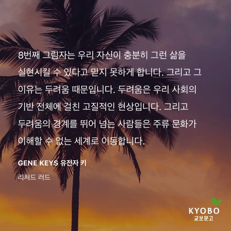 1) 8번째 그림자는 우리 자신이 충분히 그런 삶을 실현시킬 수 있다고 믿지 못하게 합니다. 그리고 그 이유는 두려움 때문입니다. 두려움은 우리 사회의 기반 전체에 걸친 고질적인 현상입니다. 그리고 두려움의 경계를 뛰어넘는 사람들은 주류 문화가 이해할 수 없는 세계로 이용합니다.