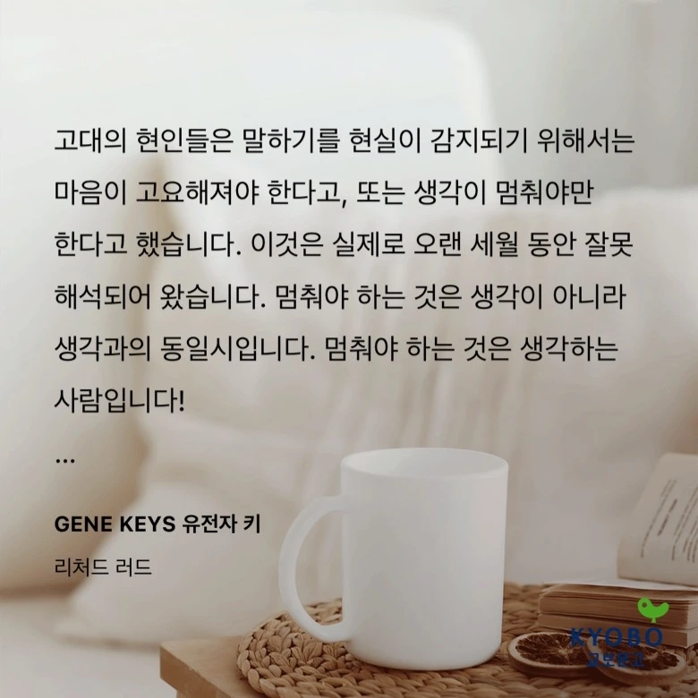 고대의 현인들은 말하기를 현실이 감지되기 위해서는 마음이 고요해져야 한다고, 또는 생각이 멈춰야만 한다고 했습니다. 이것은 실제로 오랜 세월 동안 잘못 해석되어 왔습니다. 멈춰야 하는 것은 생각이 아니라 생각과의 동일시입니다. 멈춰야 하는 것은 생각하는 사람입니다!