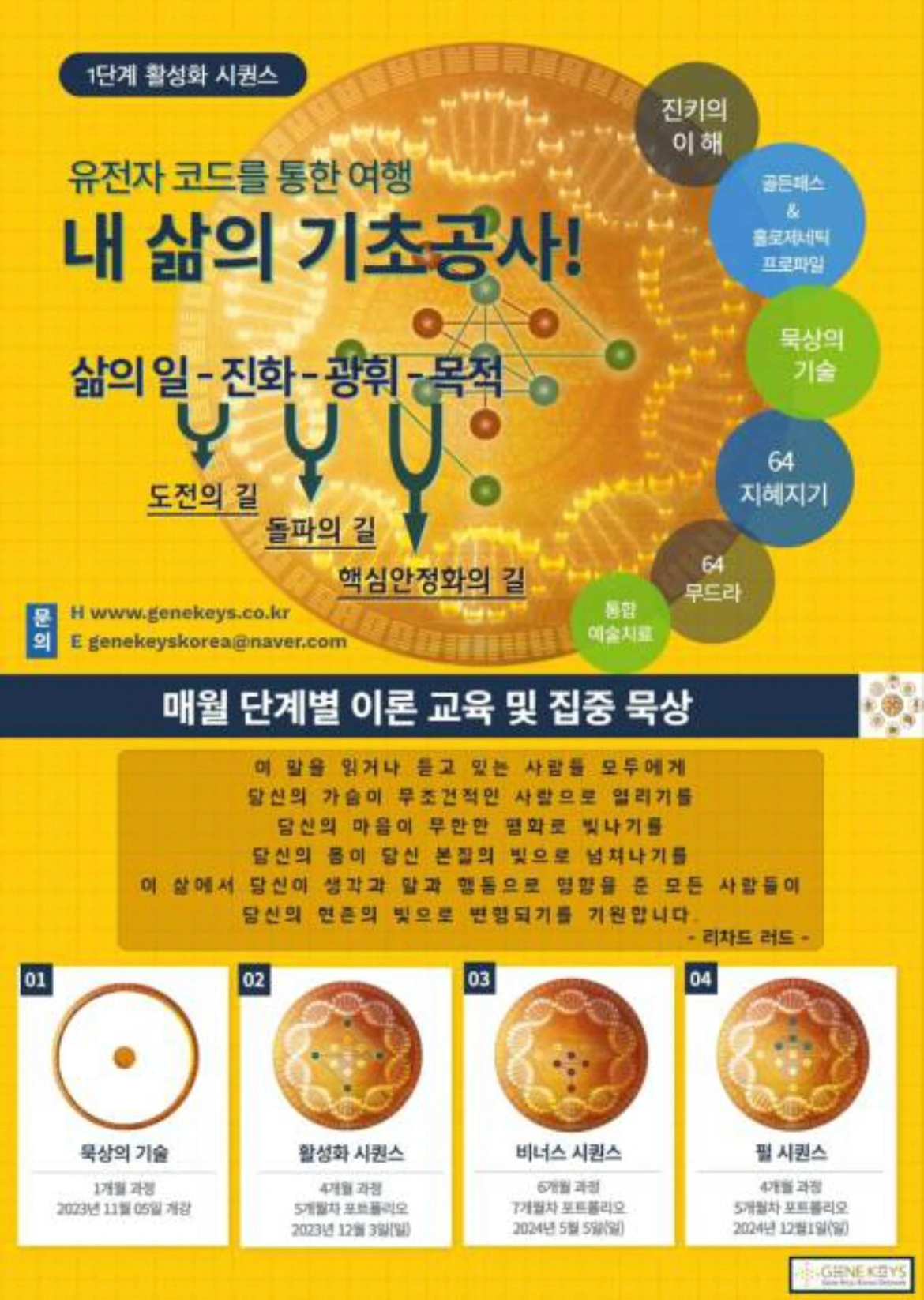 반바퀴 묵상을 하면서 나는 거대한 삼사라의 바퀴 속에 휩쓸려 들어갔다. 유전자키 네트워크에 들어온 이유는, 음양오행 독서모임을 하며 알게 된 하민석 도반님(a.k.a 오공님)의 블로그를 통해서다. 매일 하루하루의 만남과 이벤트를 자신의 삶, 나아가 목적에 이끄는 방향으로 꼼꼼하게 복기하여 묵상한 블로그 글을 읽고, 자신의 삶을 깊이 있는 방향으로 성찰하는 행위에 대해 갈증이 일었다. 주역에 해박하고, 음양오행에 도통한 그라는 것은 알고 있었지만, 블로그 글 사이사이 알 수 없는 표현들 중에는 유전자 키, 진키 등에 대한 표현이 있었다. 그리고 그에게 물으니, 몇몇 묵상들은 진키네트워크에서 수행을 하며 작성하는 과제이기도 하다고 했다.