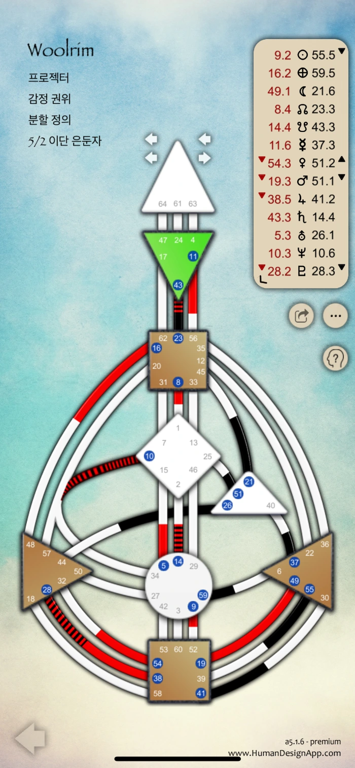 이 그림은 내 생년월일시와 태어난 장소를 기반으로 분석한 내 휴먼디자인 명식인데, 처음에는 뭐가 뭔지 알 수 없었지만, 이내 내가 태어나던 시점의 지구, 태양, 달, 노스노드, 사우스노드, 수성, 금성, 화성, 목성, 토성, 천왕성, 해왕성, 명왕성이 내 유전자에 작용하여 삶에서의 숱한 여정에서 반응하고 저항하며 진화하는 여정의 변주곡을 한 장으로 드러낸 표식이라 했다(나는 서양식 사주팔자로 이해했다).