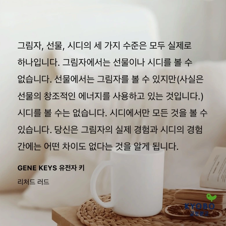 그림자, 선물, 시디의 세 가지 수준은 모두 실제로 하나입니다. 그림자에서는 선물이나 시디를 볼 수 없습니다. 선물에서는 그림자를 볼 수 있지만(사실은 선물의 창조적인 에너지를 사용하고 있는 것입니다.) 시디를 볼 수는 없습니다. 시디에서만 모든 것을 볼 수 있습니다. 당신은 그림자의 실제 경험과 시디의 경험 간에는 어떤 차이도 없다는 것을 알게 됩니다.
