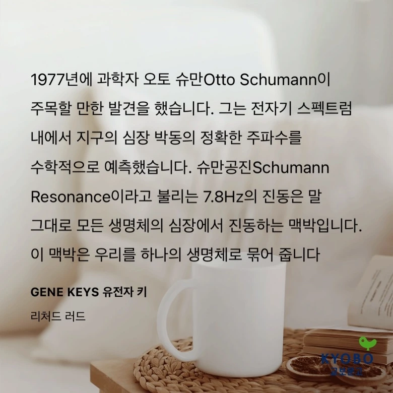 1977년에 과학자 오토 슈만 Otto Schumann이 주목할 만한 발견을 했습니다. 그는 전자기 스펙트럼 내에서 지구의 심장 박동의 정확한 주파수를 수학적으로 예측했습니다. 슈만공진 Schumann Resonance이라고 불리는 7.8Hz의 진동은 말 그대로 모든 생명체의 심장에서 진동하는 맥박입니다.
