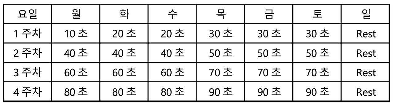 <주의사항> 힘들어서 자세가 무너질 것 같다면 무릎을 내려놓고 중간에 10초 정도 쉬되, 끊어 서 하더라도 매일의 주어진 기록을 채워서 도전할 수 있도록 노력해 보세요. 만일 부득이하게 빠진 날이 있다면 3일 전 목표로 돌아가서 도전을 이어가 보세요(예: 3주 차 화요일에 부득이 휴식을 할 수밖에 없었다면 2주 차 금요일의 목표였던 50초부터 도전을 이어갑니다) 매일의 플랭크 기록과 더불어 열심히 해내고 있는 나를 듬뿍 칭찬해 주세요.