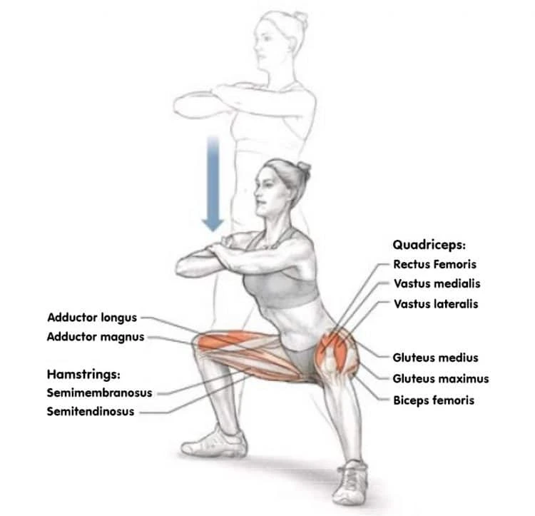 와이드스쾃의 주 자극점은 허벅지 안쪽 내전근이며 양다리를 골반 너비 2배 정도 넓게 벌리고 시작합니다.