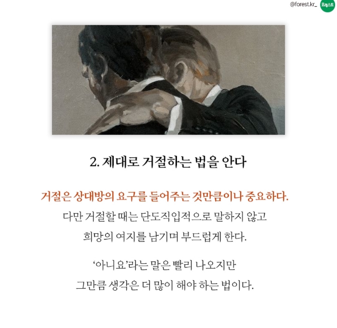 요즘 나는 건강한 바운더리, 연결감이 있는 거리감, 존중감이 있는 거절을 고민하고 있다. 상대의 입장을 고민해 서운하지 않도록 거절하고 부탁할 수 있도록 더욱 마음을 쓴다. 거절이 단절감이 아닌 더 큰 연결감으로 이어지도록 하기 위해. 그러면서도 거절할 수 있는 안전거리를 확보하기 위해.