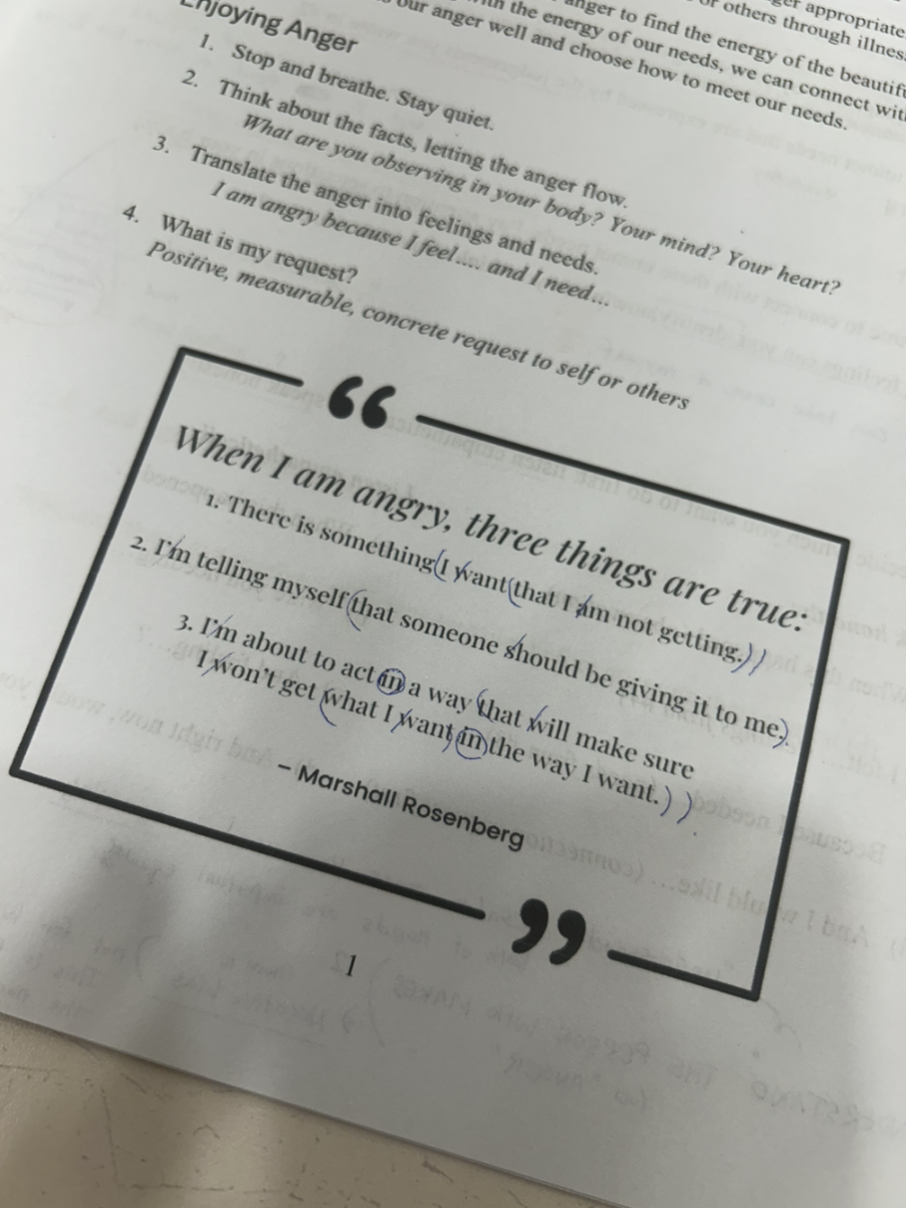 Gradually, I am becoming more adept at recognizing and expressing my emotions. I am freeing myself from the habit of bottling up my feelings and then exploding in anger, demanding that others acknowledge my needs. Nonviolent Communication seems like a worthwhile practice, requiring a lot of training, and "nonviolence" seems like a topic worth exploring before even getting to "communication." I wonder if there will be another session I can join. With only about a month left before studying abroad, I saved the session schedule with anticipation.