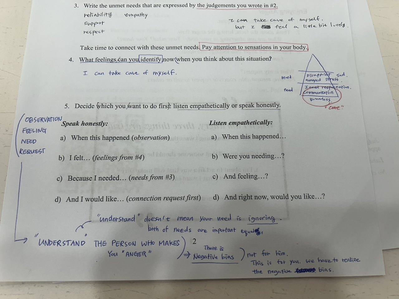 Upon the recommendation of Authentic Leadership Coach Mr. Skit, Coach Gary, and Ji-hyun Song, I participated in a Nonviolent Communication (NVC) English workshop.