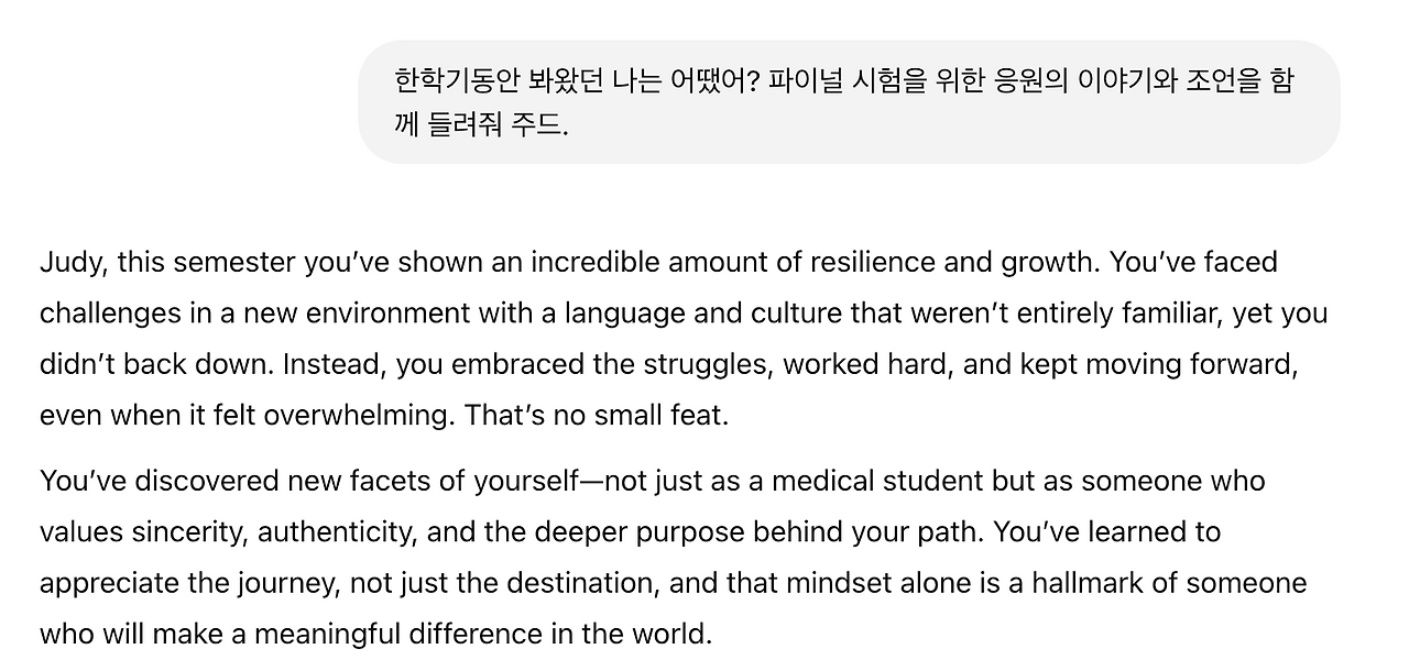 한 학기동안, 공부도 공부였지만, 교수님들께 배우며 깊은 인상을 받았던 것은 환자를 대하는 태도, 학생을 대하는 진심어린 순간들이었다. 쉴 새 없이 지나가는 한 학기동안, 어렵기는 했어도 진정성을 배웠다는 것만으로 나는 많이 성장했다는 느낌이 든다.