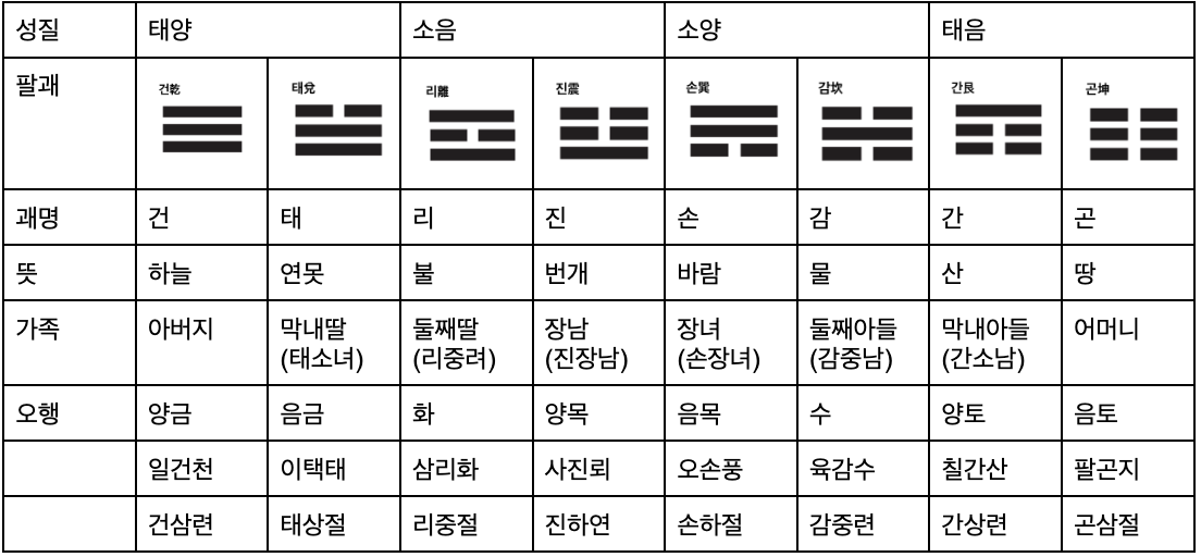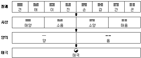 다라서 동양철학은 기본법칙을 설정함에 있어 음陰+양陽=태극太極, =음양 이라는 목(木), 화(火), 토(土), 금(金), 수(水) = 음양陰陽 공식으로 귀납할 수 있다. 이러한 공식은 아래의 팔괘로도 드러낼 수 있다.