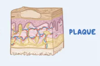 - Plaque 는 10mm 이상의 넓고 두꺼운 피부층이 융기된 병변을 말한다. 건선 Psoriasis, 태선화 Lichen planus 등의 병변이 플라크 형태로 드러난다.