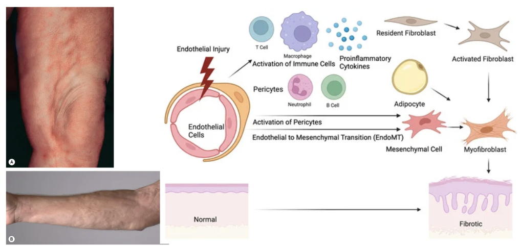 주의) 켈로이드(keloid) 는 콜라겐 조직 과증식(피부표면, 진피층), sclerosis 는 connective tissue 과증식(피부, 내부장기까지 영향)