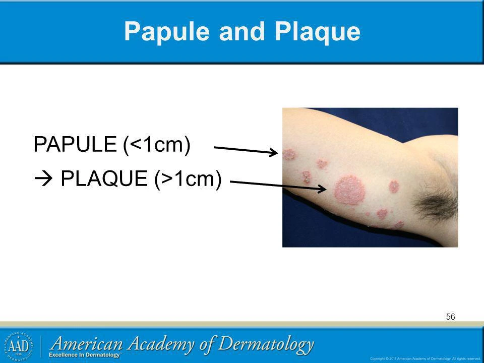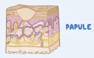 - Papule: 10mm 미만으로 단단한 돌출이 있는 여드름hard protrusion acne, 사마귀warts, 피부섬유종skin fibromas 등 등 한정된 고체 융기 병변을 의미한다.