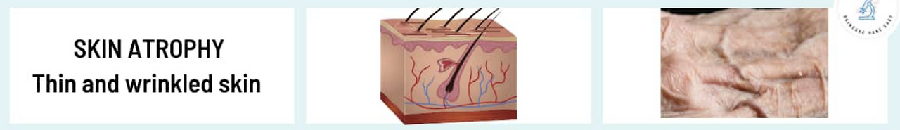 피부의 탄력이 저하elasticity decreases되며, 쉽게 주름이 생기거나 함몰sagging 됨. 피부층이 얇아져 혈관이 비쳐보일 수 있다 Blood vessels may be visible. Steroid-induced Atrophy, Aging-related Atrophy