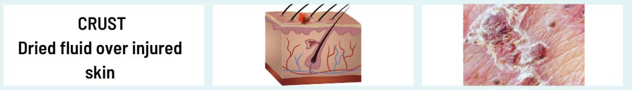 - Crust: 상처가 낫는 과정에서 삼출물(Serum, blood, pus)가 굳어져 만들어진 딱지. Cause 에 따라 딱지의 색이 달라진다.