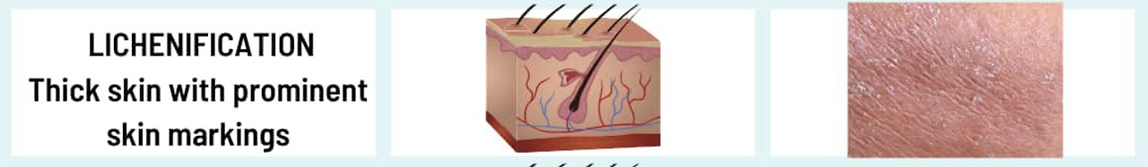 - Lichenification: 태선화. 만성 가려움증(Chronic friction) 으로 인해 긁힌 상처(scratching)로 발생하는 넓은 부위의 피부 각화(Thickened) 피부 표면 주름(wrinkles), 색소 침착(hyperpigmentation). 주로 환자가 무의식적으로 긁어서(patients unconsciously continue to scratch) 상태가 더 나빠진다. (만성 아토피피부염 chronic atopic dermatitis, 만성 습진 chronic eczema, 신경성피부염 neurodermatitis)