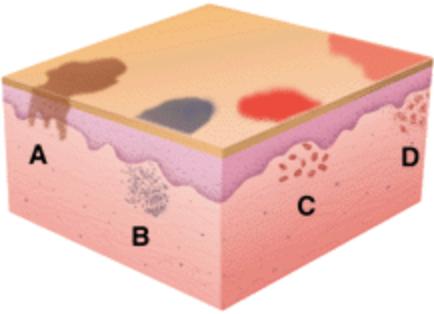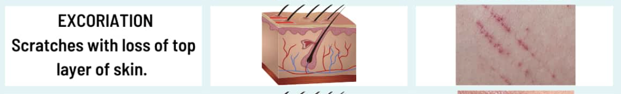 - Excoriation: 긁힌 상처. 가장 표면 표피층의 손실. 반복적으로 긁어서 손상되는 형태의 병변. 상처 부위가 붉거나 Crust 가 형성된다. Pruritus 가려움으로 인해 무의식적으로 환자가 계속 긁음. 2차 감염 위험이 있으며 심한 경우 Lichenification 으로 진행됨. 아토피 피부염(Atopic Dermatitis), 정신적 원인으로 인한 피부 긁힘 (Neurotic Excoriation), 여드름 상처 덧남 (Acne Excoriée) → 여드름을 손으로 만지면서 피부가 벗겨진 상태