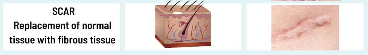 - Scar: 진피(Dermis)까지 손상된 후 치유 과정에서 형성됨. Scar tissue 는 부드럽고 탄력이 떨어져 정상 피부와 구분된다. 정상적인 흉터보다 과증식해 Keloid 가 발생하는 경우도 있다. 수술 흉터 (Surgical Scar), 켈로이드 (Keloid)