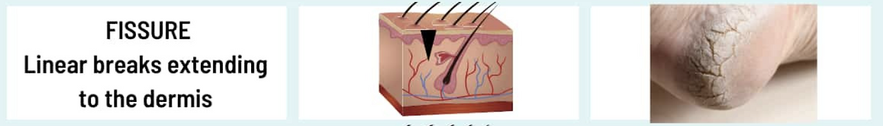 - Fissure: 피부가 선형으로 깊게 갈라짐(skin deeply cracks in a linear fashion). 건조한 환경에서 쉽게 발생하며, 만성적으로 진행된다. 진피층까지 짚게 갈라지므로, 통증이 심하며 감염 위험이 크다. 건조해 피부의 유연성이 감소된 부위(heel, edge of mouth) 등에서 발생하는 경우가 많다. 발뒤꿈치 균열 (Heel Crack, Heel Fissure), 입술 균열 (Cheilitis, Angular Cheilitis)