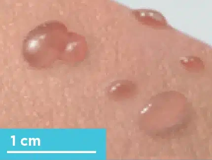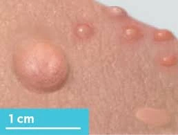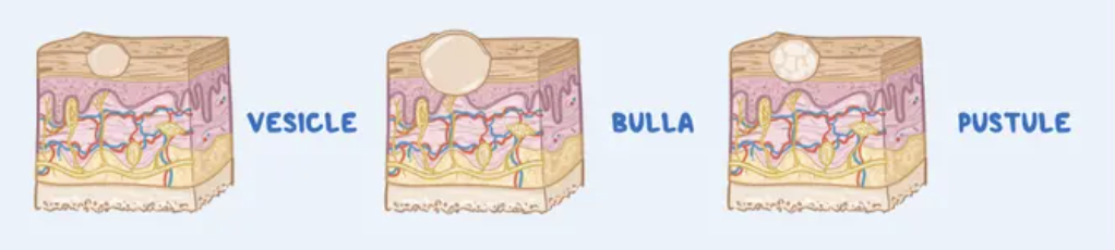 - Vesicle: 10mm 이하의 작은 수포. 표피층에, serum(Trans parent liquid 투명한 액체)이 고여서 형성된 병변이다. chicken pox (수두), herpes simplex infection (헤르페스 균 감염) 등이 원인이 되어 발생한다.