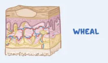 - Wheal: 일시적으로 피부가 부어오르는 부종성 병변Temporary swelling skin lesions that are edematous. 경계가 불규칙하며 종종 가려움을 동반한다. 히스타민 반응 histamine reaction으로 발생하며 주로 몇시간 후 가라앉는다. 혈관투과성vascular permeability 이 증가하여 형성되며 체액 이탈allowing fluid to escape 로 인해 일시적 부종이 생긴다. 두드러기(Urticaria, Hives), 벌레 물린 자국(Insect bite reaction), 알레르기 반응(Allergic reaction)