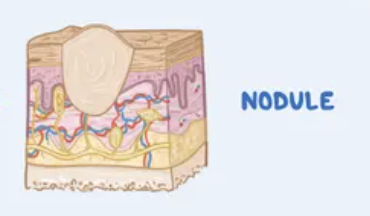 - Nodule: 1~2cm 이하, 표층과 진피층에 닿는 10mm 이상의 깊고 딱딱한 결절. benign 양성 또는 inflammation 염증 반응으로 발생한다. skin cancer 피부암의 전단계나 피부섬유종 Dermatofibroma, 여드름 결절Nodular acne, 류마티스 결절Rheumatoid nodule