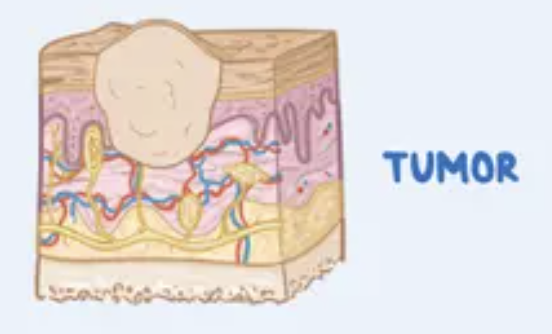 - Tumor: 2cm 이상. 표층, 진피층, 피하지방층까지 깊이 침범한다. 경계가 불명확할 수 있으며 단단하고 고무 같은 느낌이다. benign 또는 malignant 가능하며 세포증식 proliferation 이 주 원인이므로, 수 개월에서 수년 동안 점차 크기가 커진다. 지방종(Lipoma), 기저세포암(Basal Cell Carcinoma), 흑색종(Melanoma).