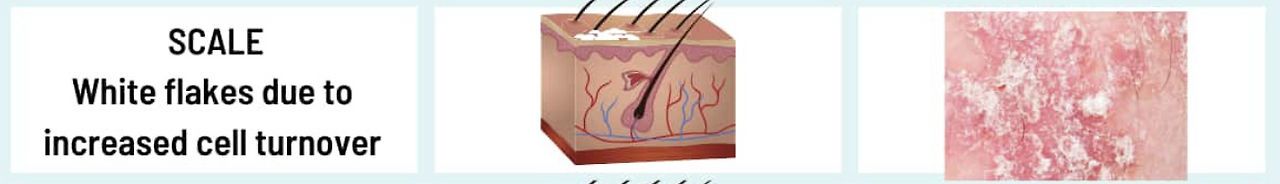 - Scale : 표피가 과도한 케라틴 형성(hyperkeratosis)작용으로 벗겨지는 현상. 표피층의 과증식(hyperproliferation of the stratum corneum) 또는 비정상적인 케라틴형성(abnormal keratinization of the stratum corneum), 이상각화 parakeratosis 로 인해 발생. 흰색, 은색, 노란색 등 다양한 컬러. 피부는 종종 건조하고 거칠고 비늘처럼 들뜬다(flaky)