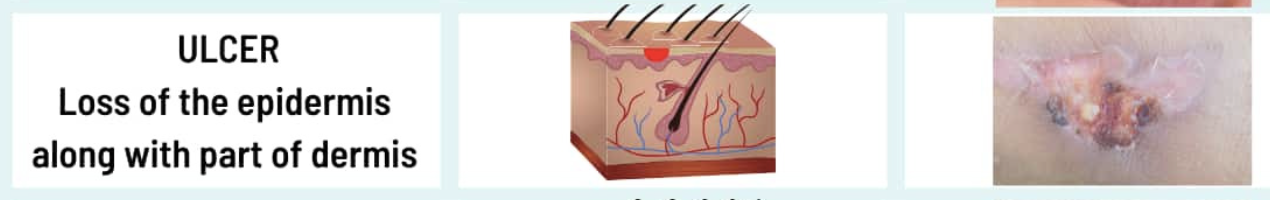 - Ulcer: 표피 뿐만 아니라 진피층에 이르는 깊은 피부 손실. 염증, 감염이 동반되며 치유과정이 느리다. 흉터가 생길 수 있다. 허혈(ischemiea), 감염(infection), 당뇨(diabetic mellitus) 등 만성 질환과 관련된다. 당뇨병성 궤양 (Diabetic Ulcer), 욕창 (Pressure Ulcer, Bed Sore), Venous Stasis Ulcer, Ischemic Ulcer