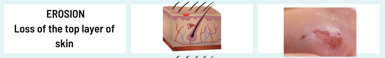 - Erosion: 표피층의 얕은 피부 손실 병변. Dermis 진피 층까지 손상되지 않으므로 대체로 흉터 없이 치유된다. 삼출물(effusion)이 나올 수 있으며 특히 mambrane 조직에서는 더 쉽게 발생한다. 단순포진 후 미란 Post-Herpetic Erosion 헤르페스 병변이 터진 후 남은 얕은 상처, 마찰성 피부염 Intertrigo, Frictional Dermatitis 등에서 발생한다.