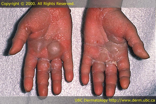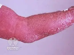 - Erythroderma: 홍색 피부증. 전신적으로 피부가 붉어지고 각질이 벗겨지는 (generalized skin redness and scaling) 심각한 피부 질환(severe skin condition), the skin may be red 붉어지고, warm 따뜻하며, dry 건조하고 and itchy 가려움. 전신 증상(systemic simptom)으로 체온조절 장애(impaired temperature regulation), 탈수(dehydration), 전해질불균형(electolyte imbalance) 등을 유발. 약물반응Drug-induced Erythroderma, 심한 건선 psoriasis, 아토피성 피부염 atopic dermatitis 등이 원인이 되어 드러남.