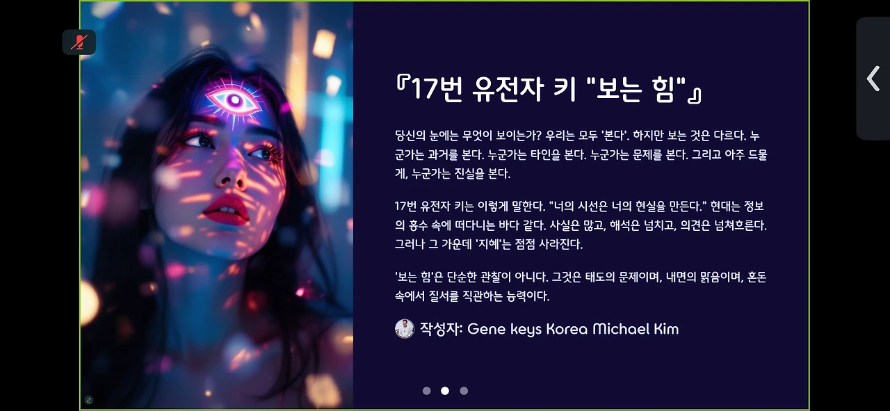 그때부터 관계는 놀이가 된다. 심각한 좌뇌의 프레임에서 벗어나면 가슴이 피워낸 꽃을 통해 내면의 눈은 뇌와 순수의식 사이의 연결고리를 생성하기 시작한다. 17번 게이트가 시디주파수에서 발동하면, 과거, 햔재, 미래가 하나의 화면에서 작동하며 영원한 의식의 화면으로 작용한다.
