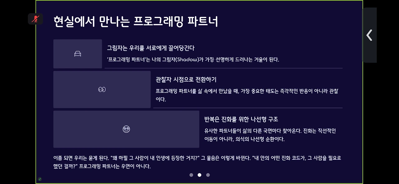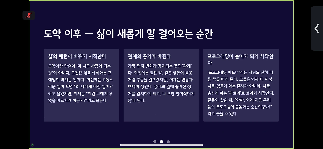 도약 이후, 상대와 나를 보는 나의 태도가 달라졌을 때 비로소 삶이 새롭게 말을 걸어오기 시작한다. 그동안 의견 충돌을 거듭하며 분별하던 패턴이 스스로 끊어지는 시점이 온다. 도약이란 막연히 ‘더 나은 사람’ 이 되는 길이 아니다. 삶을 해석하는 프레임이 바뀌는 것이다. 나를 보호하려는 희생자 프레임에서 벗어나, 내가 무엇을 배울 수 있을 것인가라는 주도권의 프레임에서 삶과 관계는 바뀌기 시작한다.