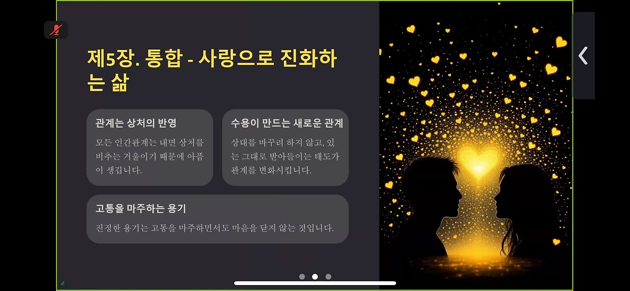 수용 속에서 인간의 고통에 가슴을 열고, 고통이 주는 진화와 각성에 기꺼이 내 몸을 변형으로 내어줄수록, 보편적 사랑의 장미가 피어나는 영구적 도약이 일어난다. 사랑은 얻거나 가지거나 행위할 수 없는, 존재 자체이다.