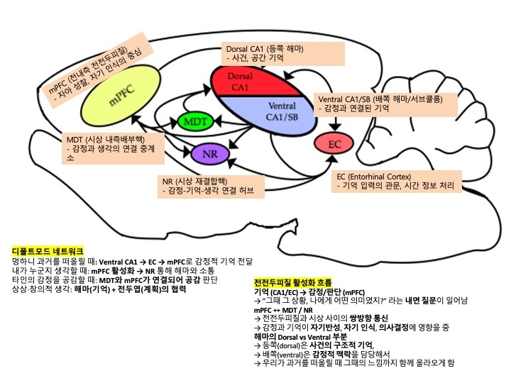 기억은 다시 **EC(내후각피질)**를 거쳐 mPFC로 전달된다.이 흐름이 우리가 과거의 경험을 ‘지금 여기’에서 떠올리는 구조다.