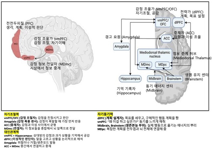 **MDT(시상 내측 배부핵)**는 감정과 생각을 잇는 중계소 역할을 한다.