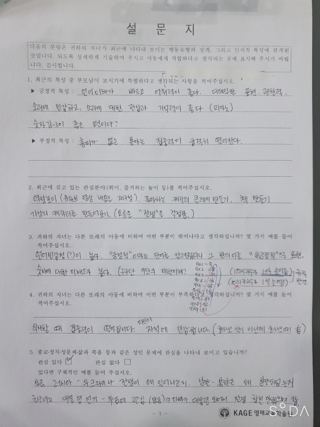 아이가 웩슬러 지능검사를 받는동안 부모가 작성하는 설문지