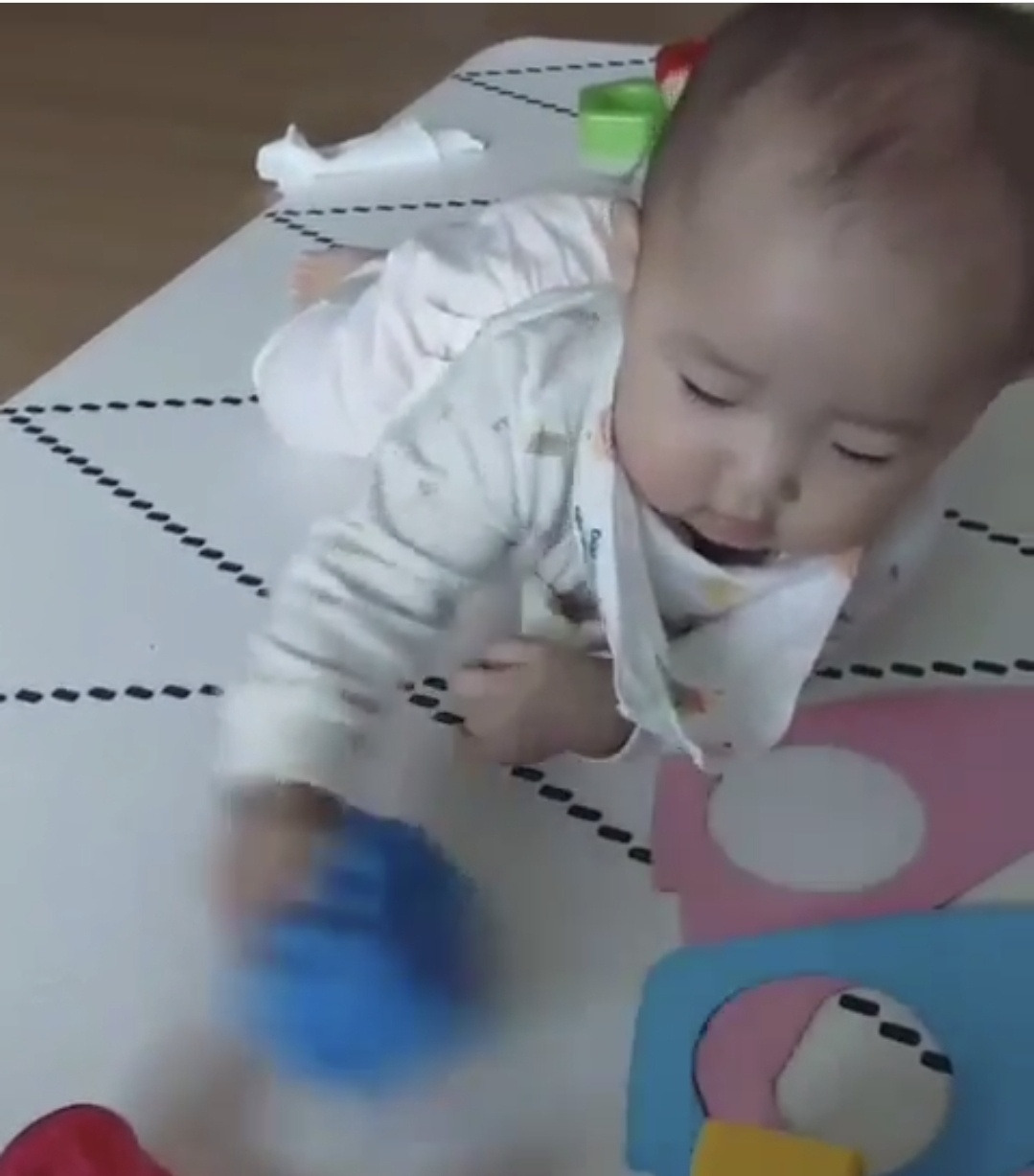 생후 9개월, 블럭을 잡아서 분리하고 뒤로 던져보고는 소리를 따라 시선이 가는 중