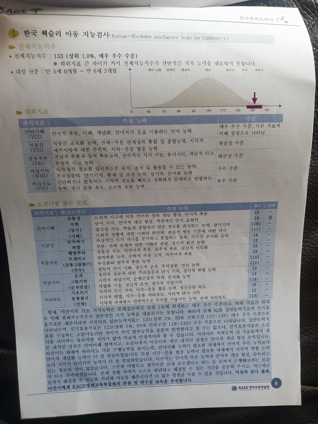 받은 검사 결과지다. 우리 아이는 15%이내의 아이들이 수업을 받을 수 있는 KAGE 영재교육 연구실에서