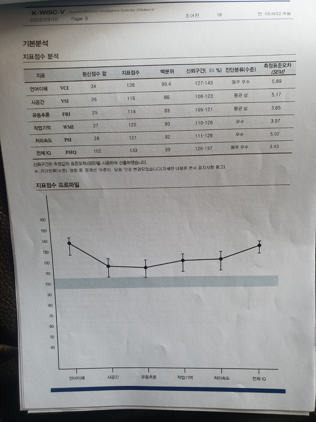 2022년 3월에 받은 한국 웩슬러 아동 지능검사 결과