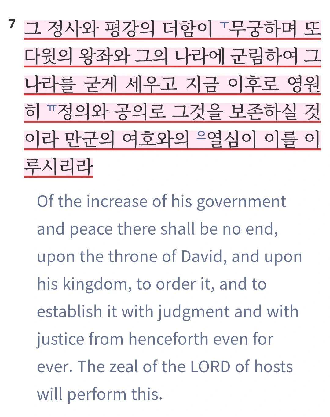 그 정사와 평강의 더함이 무궁하며 또 다윗의 왕좌와 그의 나라에 군림하여 그 나라를 굳게 세우고 지금 이후로 영원히 정의와 공의로 그것을 보존하실 것이라 만군의 여호와의 열심이 이를 이루시리라
