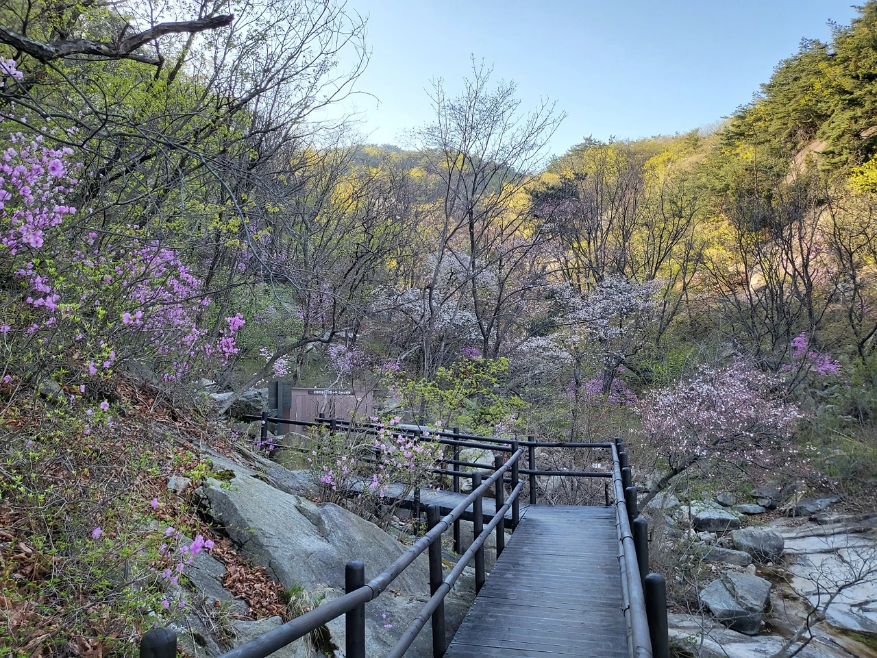 이날은 백련사에서 출발해 진달래 능선을 지나 구천폭포로 하산했다. ‘진달래 능선’이라는 이름답게 산길을 따라 양옆으로 진달래가 흐드러지게 펴있었다. 군락지라 불릴 정도로 진달래가 가득하진 않았지만 바위 사이로, 나무 사이로 듬성듬성 피어난 진달래는 또 다른 풍경을 자아냈다.