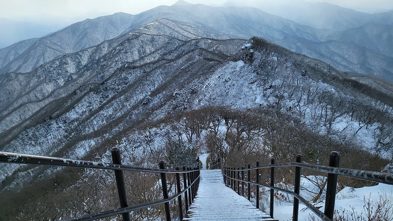 안성탐방지원센터에서 시작하면 동업령까지 힘들지만 이후 중봉부터 향적봉까지 완만한 능선길이다. 올해는 눈은 오지 않았으나 날이 맑아 눈 덮인 봉우리와 능선을 실컷 봤다. 우측으로는 겹겹의 능선이, 좌측으로는 넓은 평야가 펼쳐졌다. 매섭게 몰아치는 칼바람 탓에 양 볼에 아린 와중에도 보고도 믿기지 않는 ‘비현실적인 절경’에 자꾸만 발길이 붙잡혔다.