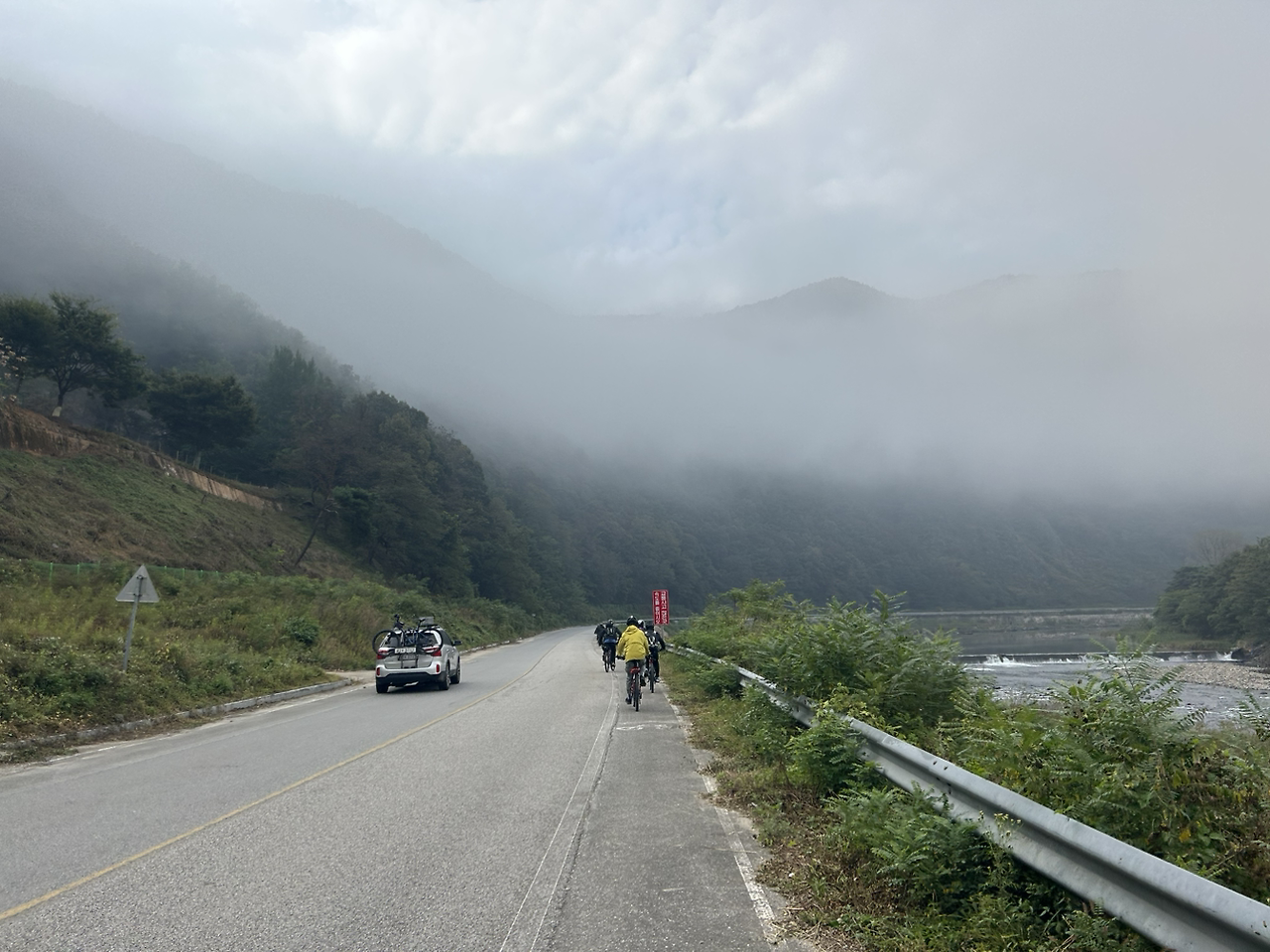 다시 출발. 며칠 자전거를 안 탔더니 몸이 찌뿌둥했다. 아마 다들 같은 기분이었을 거다. 달팽이 선생님은 차로, 나와 학생들은 자전거를 몰기 시작했다. 얼마나 갔을까. 지금은 폐역인 불정역 방향으로 가는데 산허리에 두껍게 깔린 아니, 두껍게 걸친 안개가 보였다. 구름이라고 부르고 싶을 정도. 선물 같은 풍경이었다. 다른 세상을 향해 달리는 것만 같았다. 차 타면서 봤으면 입 벌리고 있었을 텐데 자전거라 못 했다. 우리는 그 풍경을 향해서 미끄러지듯이 들어가고 있었다.