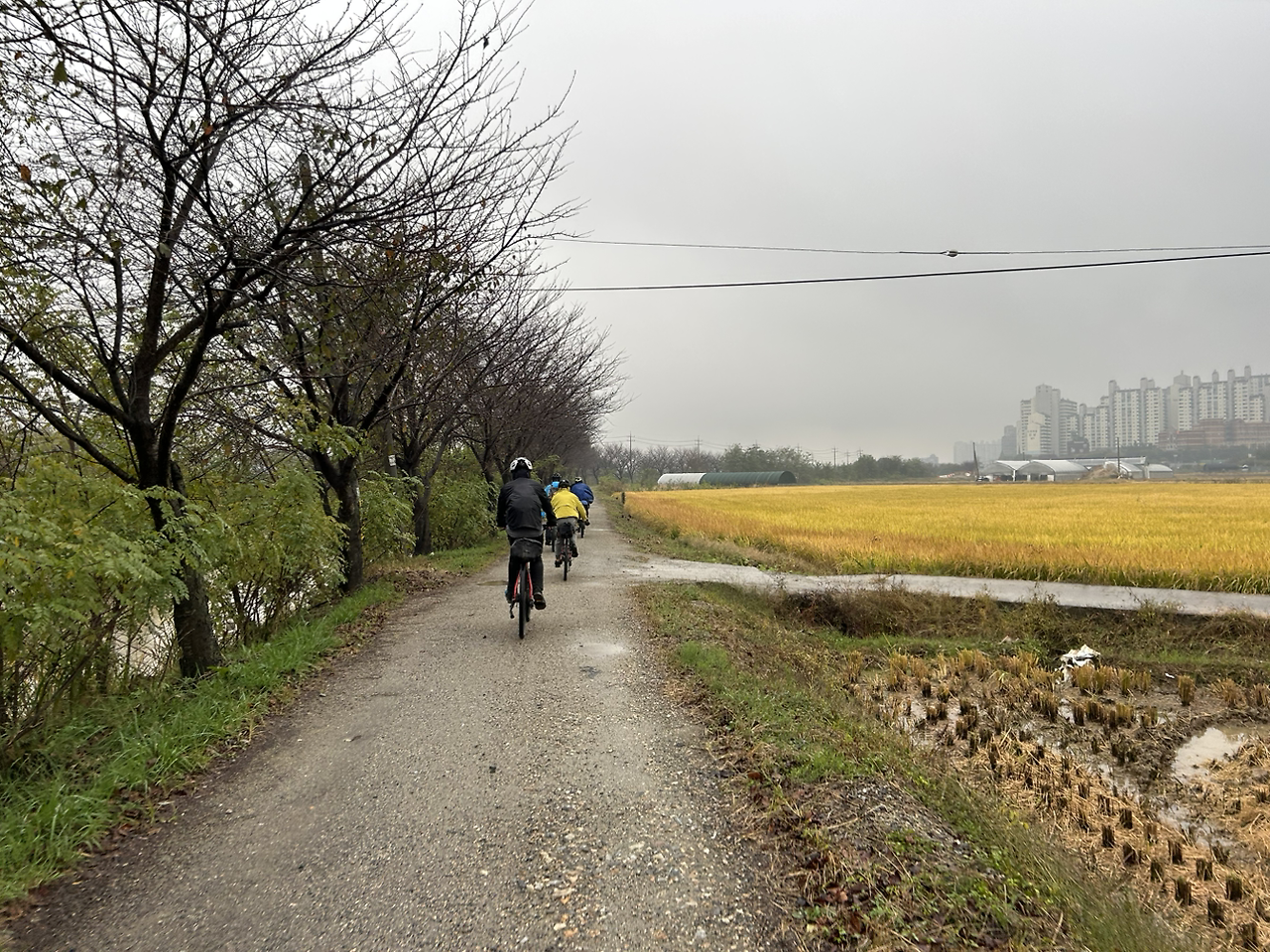 마지막 날 아침 우리를 맞이한 건 비였다. 왜 하필 마지막 날인가 싶으면서도 차라리 마지막 날이어서 잘 됐다는 생각도 들었다. 비를 쫄딱 맞고 나면 무엇보다 빨래가 문제니까. 그 많은 빨래를 돌리는 것도 문제 그리고 그리고 그 빨래들을 다음 날 출발 전에 건조하는 건 더 문제. 집에 가서들 돌리면 되니까 정말 다행이었다. 숙소에서 최종 목적지인 수원까지 약 40km. 안양천을 따라 계속 내려가는 경로였다. 중간에 쉬는 시간까지 생각한다면 3시간 정도면 도착할 수 있는 거리. 이제 정말로 끝이구나. 점심때쯤에는 도착하게 될 터였다.