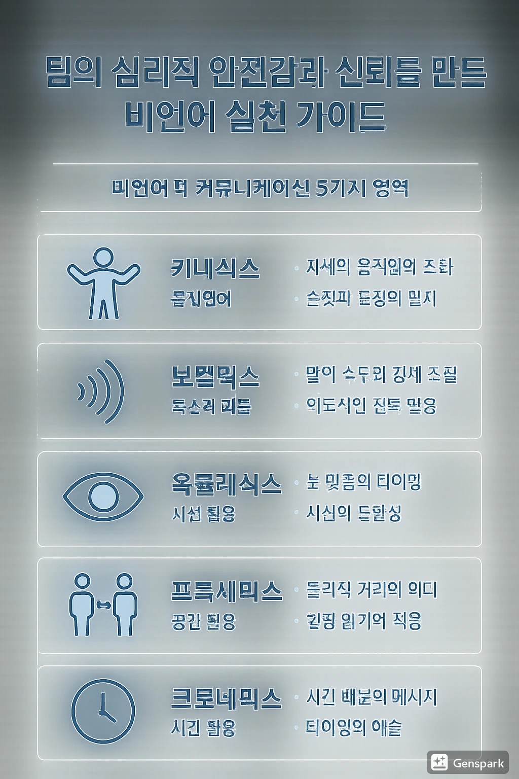 비언어적 커뮤니케이션은 크게 5가지 영역으로 분류됩니다: 키네식스(몸짓언어), 보컬릭스(음성언어), 옥큘레식스(시선), 프록세믹스(공간활용), 해픽스(접촉). 이 체계적 분류를 바탕으로 리더가 실천할 수 있는 신뢰 구축 방법을 제시합니다.