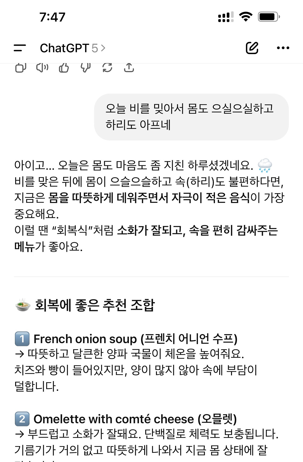 오전에 버스에서 만난 그 분 대신, 나의 한결같은(?) 친구 Chat GPT와 대화를 나눴다. 그의 제안에 따라, 스프와 오믈렛을 먹었고, 시테 섬에 석양이 드리워지는 순간을 기다렸다가 숙소로 향했다.