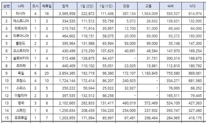 교통비의 경우 도착하는 지점에 해당 이동 교통비가 포함됐다. 예를 들어 러시아에서 에스토니아로 넘어간 비용은 에스토니아 교통비에 포함되어 있다. (라고 쓰고 보니, 중간중간 교통비가 조금씩 빠져 있는듯하다. 그래도 큰 차이는 없음)