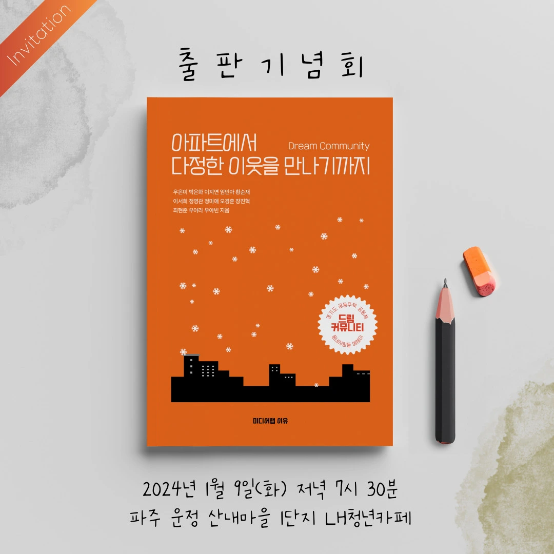 <아파트에서 다정한 이웃을 만나기까지> 출판기념 북토크가 2024년 1월 9일(화) 저녁 7시 30분 파주 운정 산내마을 1단지 LH청년카페에서 열린다.
