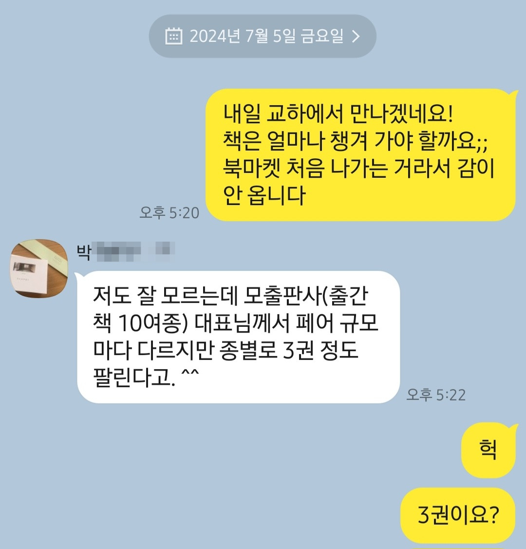 행사 전날, 북페어 경험이 있는 박 작가님께 책을 얼마나 챙겨야 하냐고 물어봤다. 페어 규모에 따라 다르겠지만 종별 3권 정도 판매된다는 말에 솔직히 설마설마했다. 그런데 정말 박 작가님이 말씀하신 딱 고만큼 팔렸다.